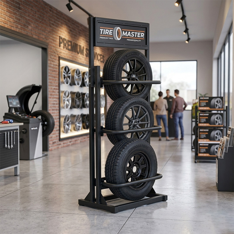 Otomotiv sektörünün zorlu şartlarına uygun, ağır yükleri zarafetle taşıyan profesyonel lastik teşhir standı tasarımı ile showroom atmosferini değiştiriyoruz. Tire Master için geliştirdiğimiz bu çözüm, dayanıklılığı bir pazarlama argümanına dönüştürüyor.
